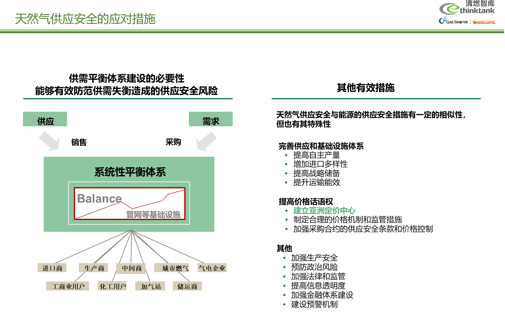 她指出,中国天然气的供应和价格是一个动态平衡系统,地缘政治和政策同时对天然气供应安全产生影响。中国天然气正处于高速发展的状态,她建议中国可以建立平衡系统,以促进天然气供应安全保障。